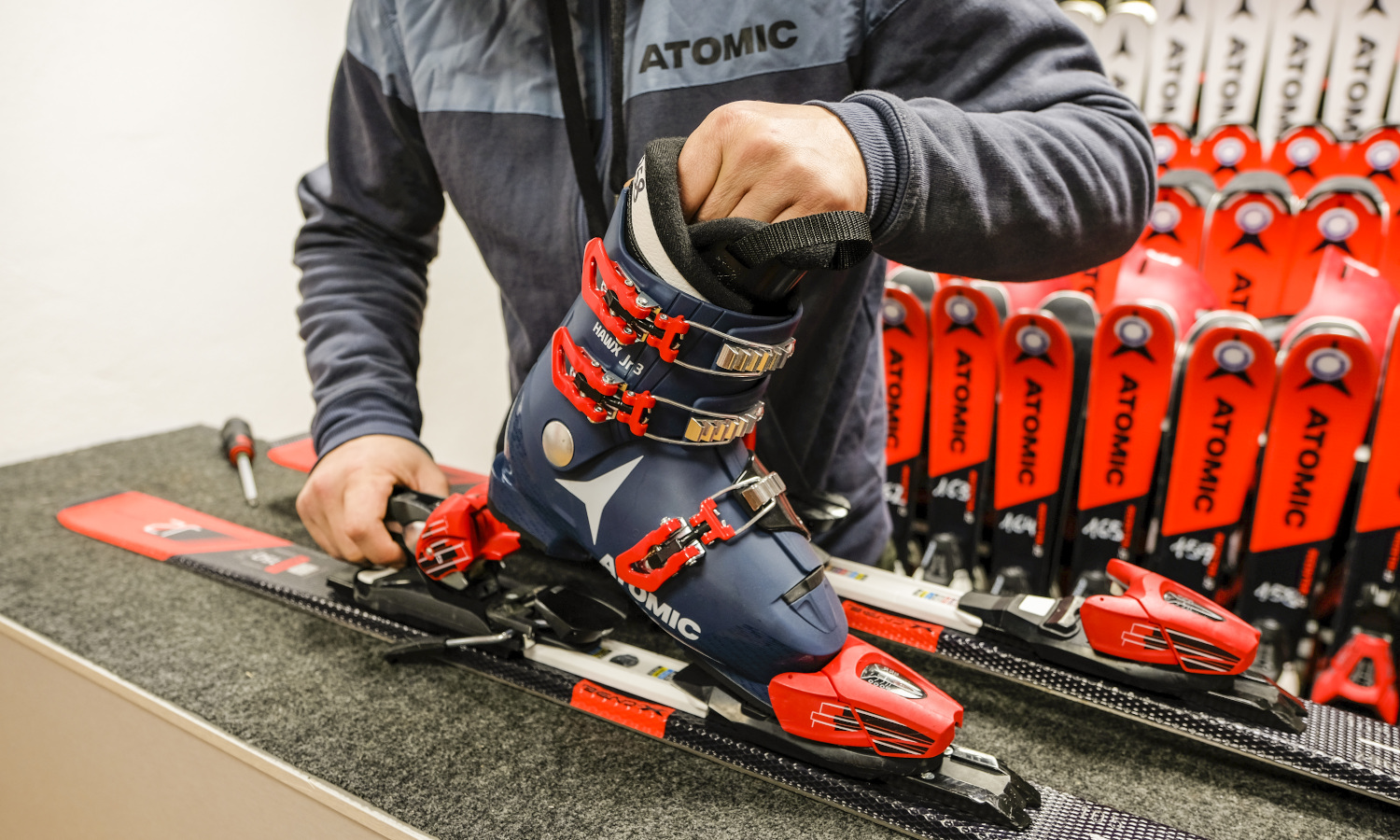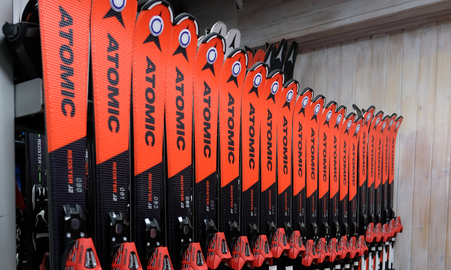 Equipos completos de esquí: tablas, botas y bastones.
