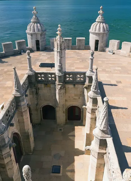 La Torre de Belém está decorada con motivos propios del estilo manuelino, como cuerdas talladas en piedra, escudos de armas y esferas armilares. También conserva matacanes y garitas defensivas que recuerdan su función militar. La combinación de solidez defensiva y ornamentación convierte al monumento en un ejemplo excepcional de la arquitectura de su tiempo.